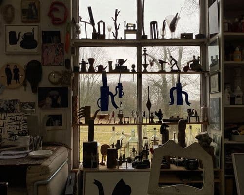 Iets na het afgesproken tijdstip parkeer ik mijn auto bij zijn atelier op Landgoed Lichtenbeek in Arnhem. Naast de voordeur een affiche: Klaas Gubbels 90th, koffiekannen op de achtergrond. Handgeschreven instructies bij de voordeurbel verraden dat Klaas gastvrij is. Hij beschouwt het ook als zijn plicht toe te lichten hoe zijn werk ontstaan is, hoor ik later.
