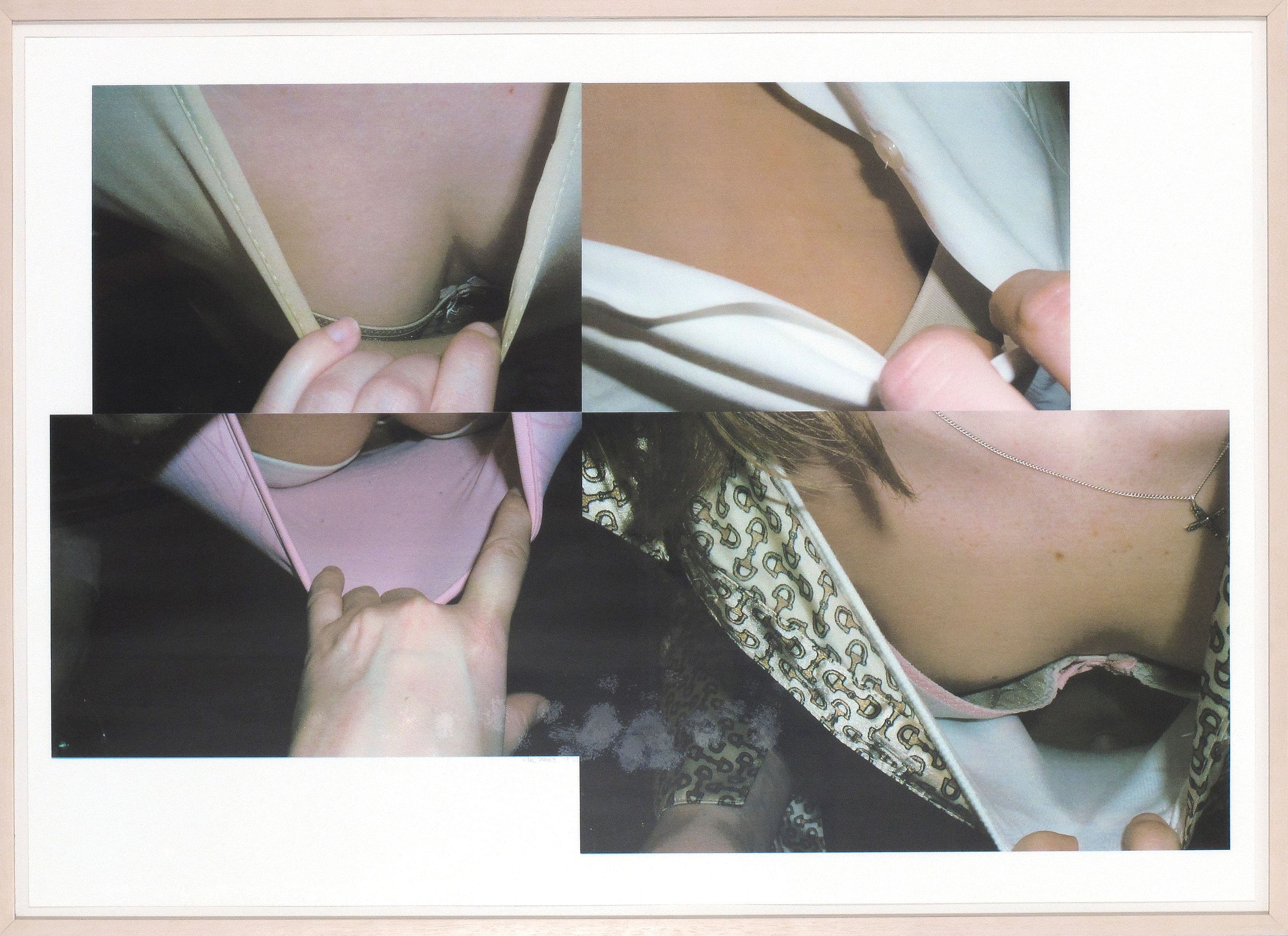 Peter: Wat we in het schilderij zien is een viertal foto's. Een fotocollage van een viertal foto's met een decolleté. Wat je daar ook bij ziet is een hand die het kledingstuk wat wegtrekt. Dat zie je.